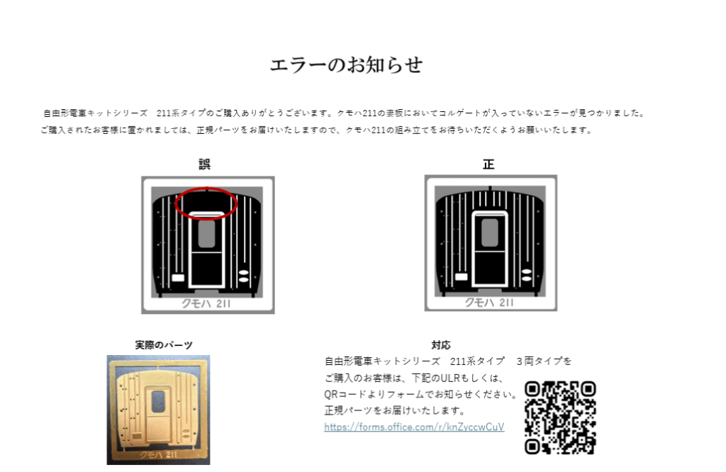 すでに、Xなどでご案内いたしております通り、211タイプ3両セットのクモハ211の妻板にエラーが発生しております。